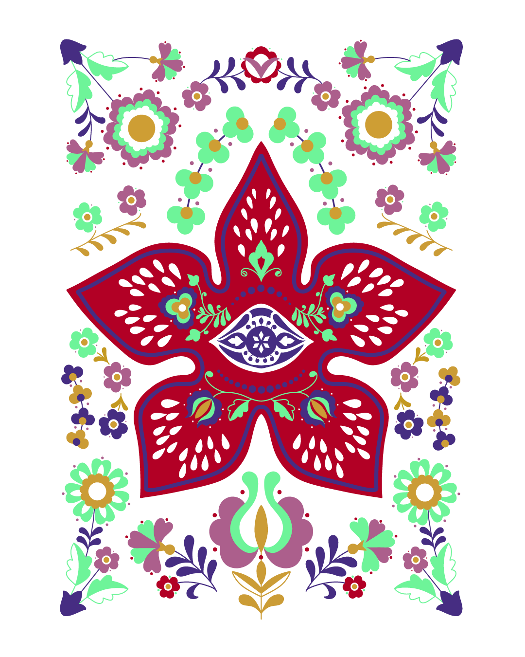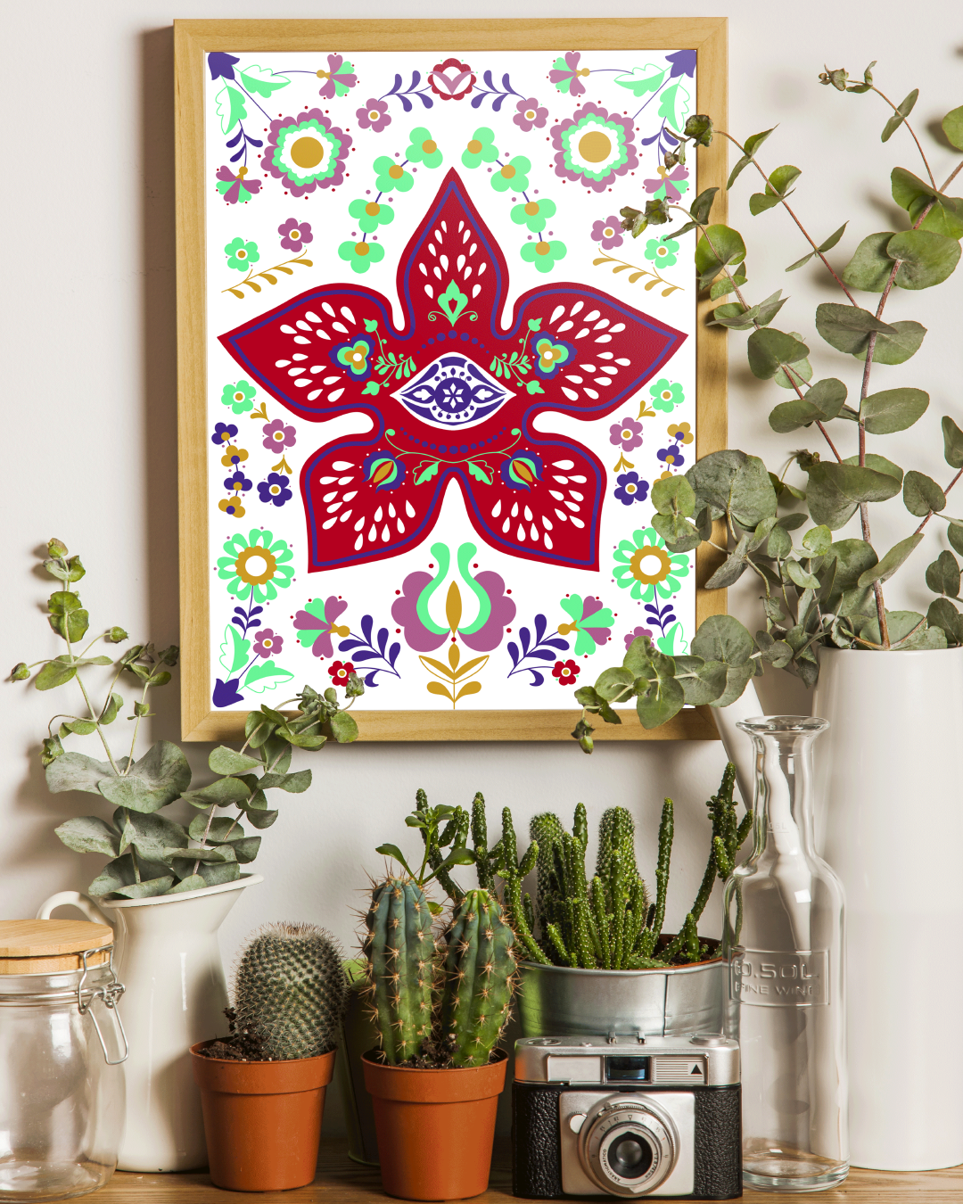 Une créature sortie du Monde à l’Envers s’invite dans ton salon. Ce Démogorgon, tout droit inspiré de Stranger Things, a été illustré dans mon style pop folk ésotérique, entre hommage geek et vibe dark mystique.